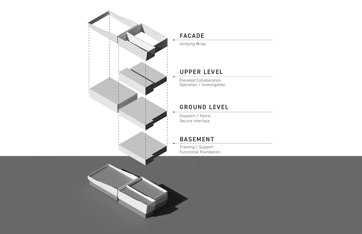 The concept was to stack the admin/community areas in a two-story volume, over a basement that served as training, lockers and fitness and doubled as an emergency shelter for the building and the community within the area and attach the single-story utility volume on the backside that also allowed for direct access to a separate secured site entry and exit.